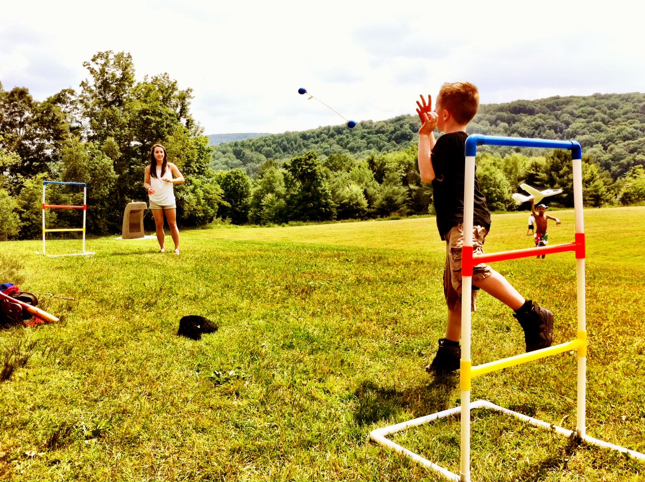 My son, with his Air Jordans, is in the foreground throwing the blue balls (I know there’s a joke in here somewhere). My oldest daughter, 10 years his senior, is waiting in the background, ready to pummel him. My other daughter, to the left of this photo, is watching and will soon master both of them at Ladder Ball.