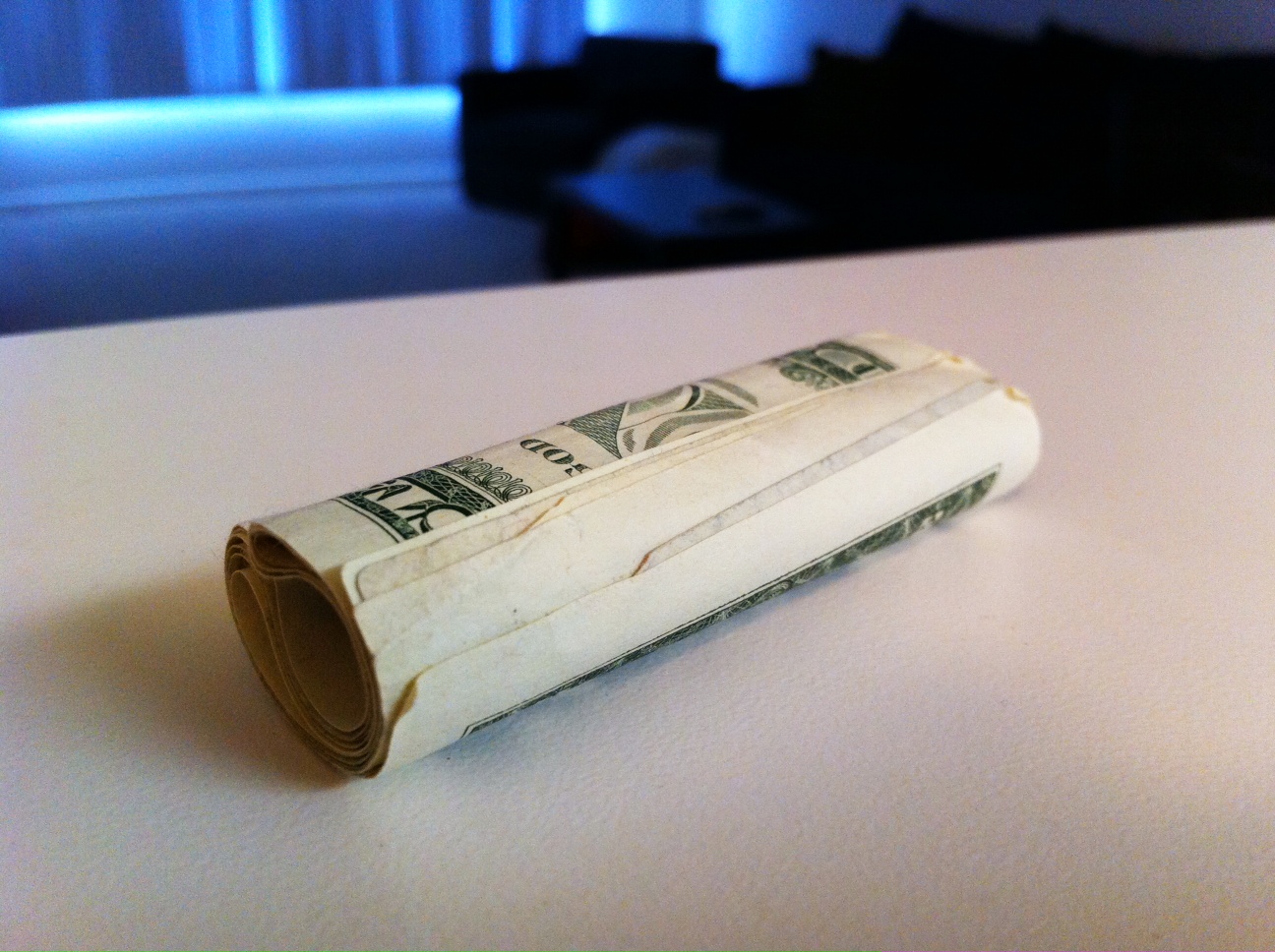 Not remembering that I left money in my pocket, combined with the fact that I found the bills rolled up as shown, made me wonder what the fuck happened to me? Did I have a night out that I can’t remember? Did I hook up with some strippers and local un-desirables and have a night of debauchery and bacchanalia? Did we go to a club, demand our own VIP section and 12 bottles of Grey Goose? Did I kick the DJ out, then rock the house by mixing prime cuts from Paul’s Boutique by the Beastie Boys with songs from Slanted and Enchanted by Pavement? Did the strippers let me snort blow off their asses with bills that I then put in the pocket of my work khakis and forget to take out when I got back to my apartment? That must be what happened. There’s no other explanation.