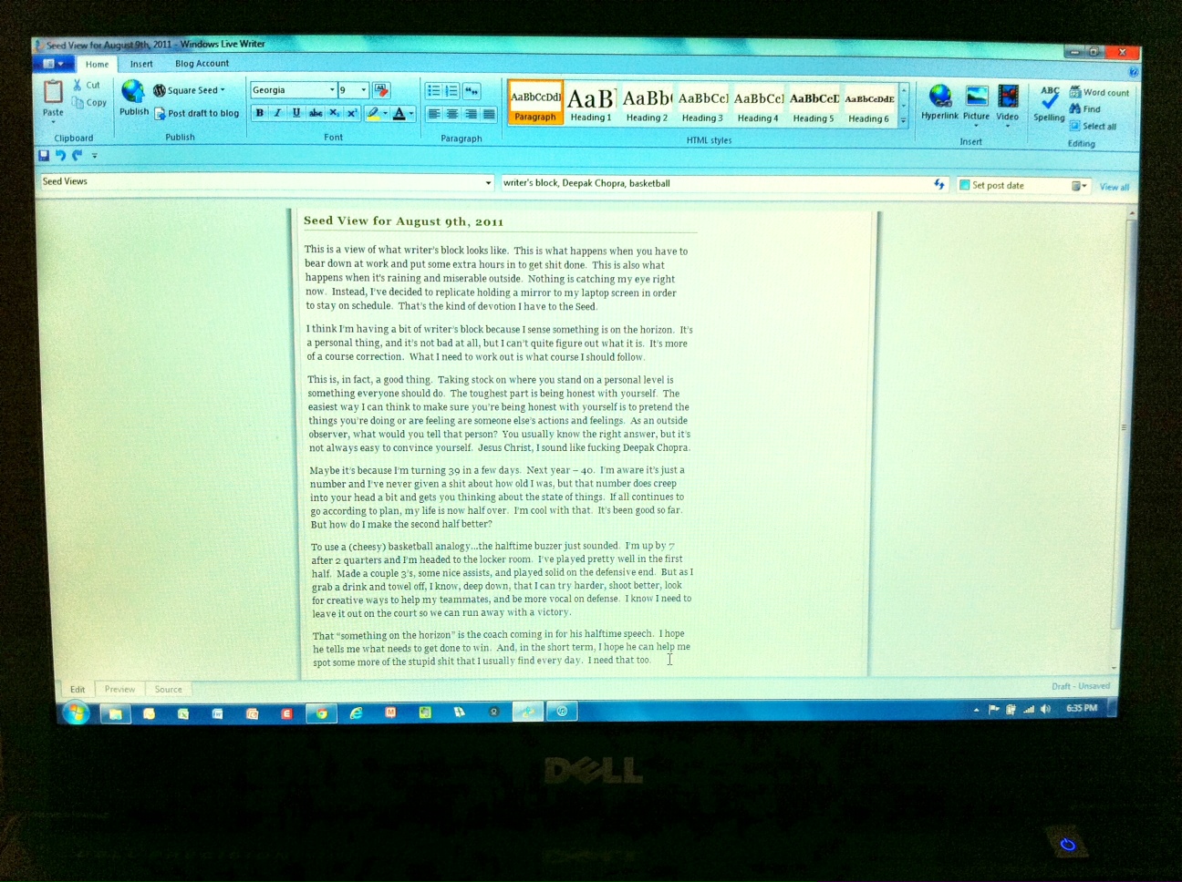 This is a view of what writer’s block looks like. This is what happens when you have to bear down at work and put some extra hours in to get shit done. This is also what happens when it’s raining and miserable outside. Nothing is catching my eye right now. Instead, I’ve decided to replicate holding a mirror to my laptop screen in order to stay on schedule. That’s the kind of devotion I have to the Seed.