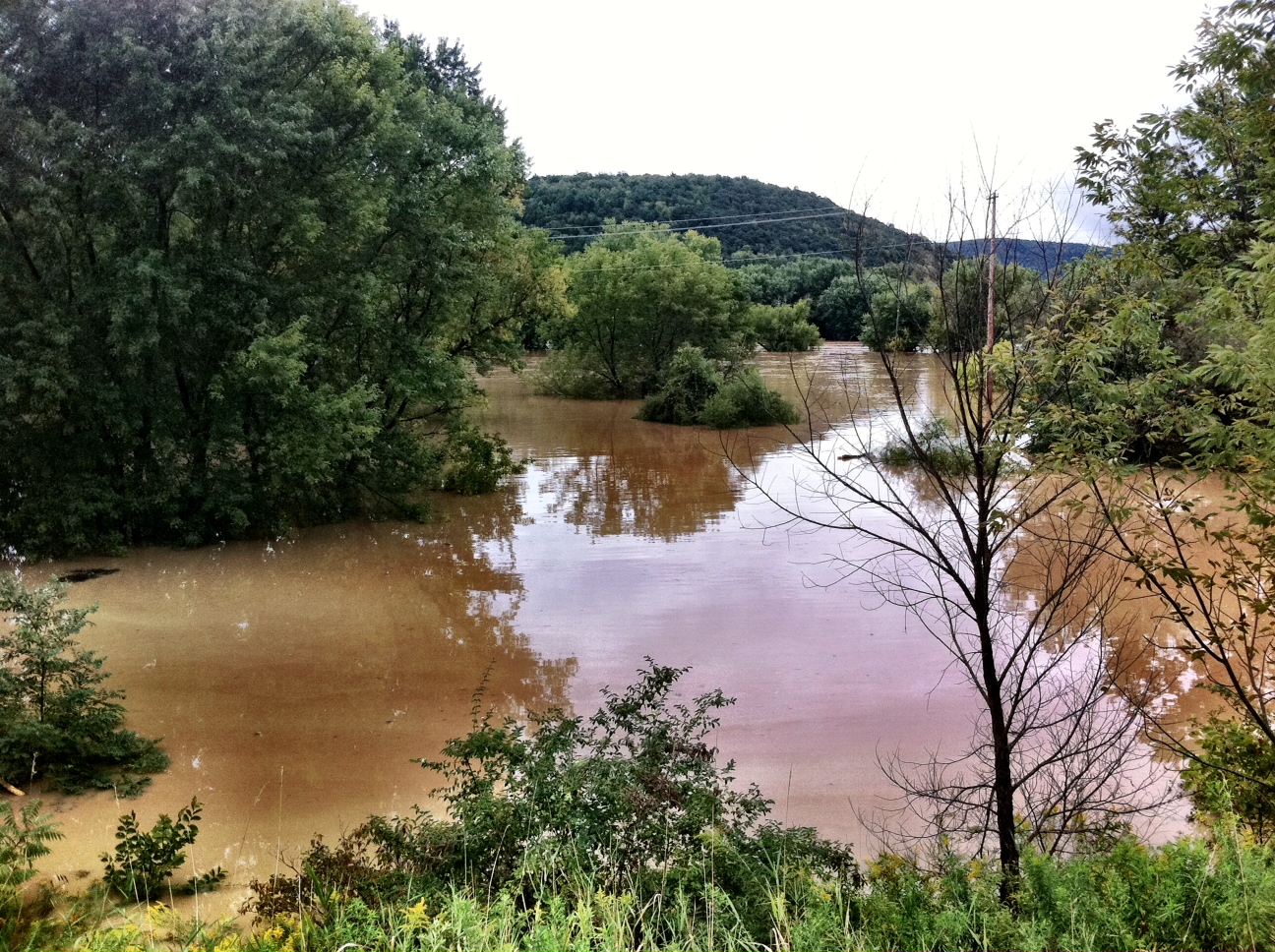 This picture was taken this afternoon in the village of Windsor, NY. This is across the street from our house. It is typically an open field with the Susquehanna River about a nice 225-yard, 3-wood away. As I was taking this picture, a couple kids rode by. I heard one say to the other, “It looks like a river of chocolate milk.” He’s right, it does.