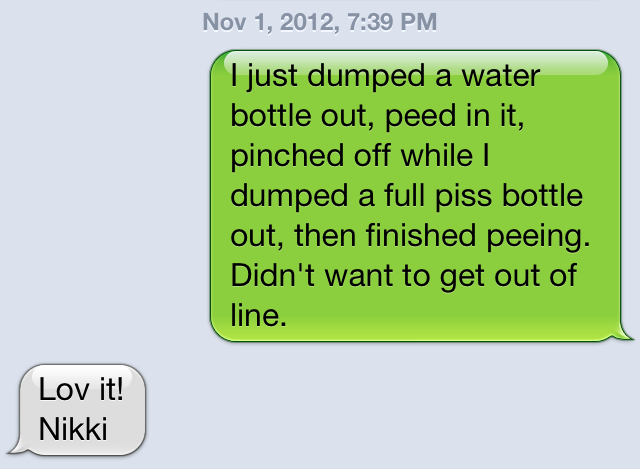 I carefully moved the car up again while keeping a firm grip on to ensure the Z-kink remained intact.  As I lined up again to rid myself of the rest of the urine, a guy started walking right towards my car from the other side of the road.  Did he just see me dump my piss?  Is he coming to reprimand me?  What the hell is going on here?  I quickly covered up as he continued to approach.  I faked looking disinterested as he eventually walked around the front of my car to the house across the street.  Thank God.  I finished Operation Piss Relief and put the bottle in my cup holder instead of dumping liquid out of the window for the third time.  Even with everything going on, the feeling of being pee-free was truly orgasmic.